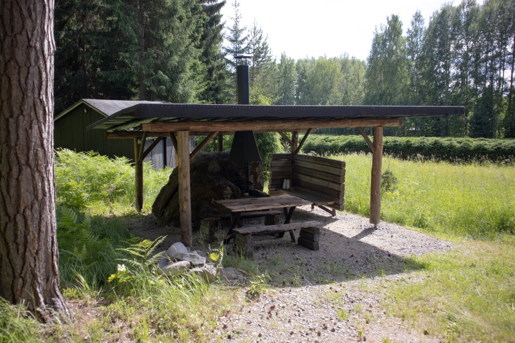 Vanhasta riihestä tehty tupa, iso grillikatos sekä suuri perinnesauna maalaismaisemassa.